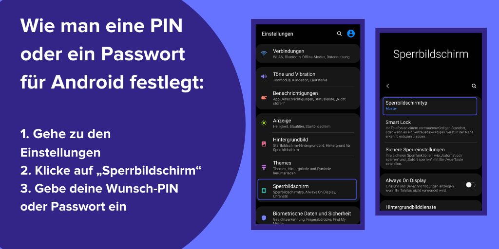 Wie man eine PIN oder ein Passwort festlegt: Einstellungen > Bildschirmsperre