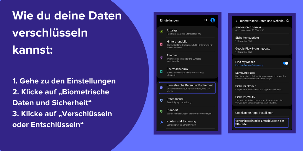 Wie du deine Daten verschlüsselst: Einstellungen > Sicherheit > Verschlüsseln oder Entschlüsseln