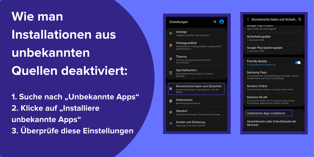Wie man Installationen aus unbekannten Quellen deaktiviert: Einstellungen > Biometrische Daten und Sicherheit > Unbekannte Apps