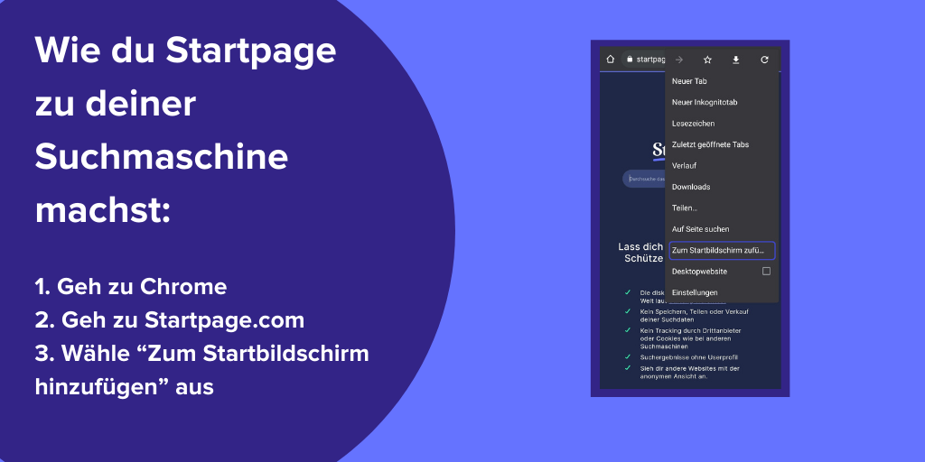 Wie du Startpage zu deiner Standardsuchmaschine machst: Google Chrome > Gehe zu startpage.com > Klicke auf das 3-Punkte-Menü > Zum Startbildschirm hinzufügen > Hinzufügen