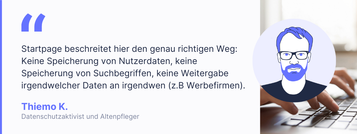 Startpage beschreitet hier den genau richtigen Weg: Keine Speicherung von Nutzerdaten, keine Speicherung von Suchbegriffen, keine Weitergabe irgendwelcher Daten an irgendwen (z.B Werbefirmen).
