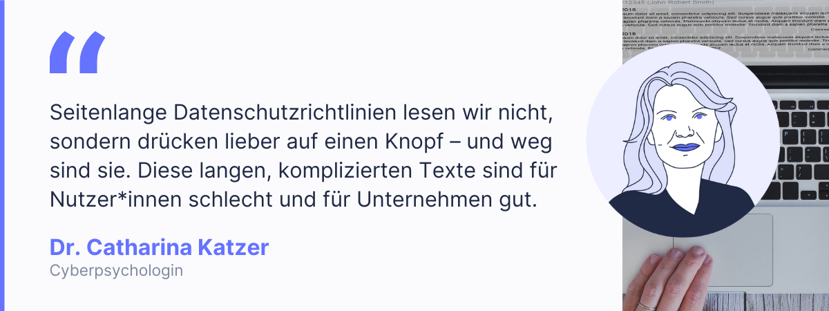 Außerdem zeigt die Forschung, dass wir maximal 15% dessen, was wir finden, auch tatsächlich lesen. Die meisten Informationen werden nur noch nach Dingen gescannt, die uns schon bekannt vorkommen. Seitenlange Datenschutzrichtlinien lesen wir nicht, sondern drücken lieber auf einen Knopf – und weg sind sie. Diese langen, komplizierten Texte sind für Nutzer*innen schlecht und für Unternehmen gut.