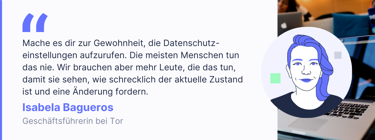 Danach mache es dir zur Gewohnheit, die Datenschutzeinstellungen aufzurufen. Die meisten Menschen tun das nie. Wir brauchen aber mehr Leute, die das tun, damit sie sehen, wie schrecklich der aktuelle Zustand ist und eine Änderung fordern. Die Beschwerden von Nutzer*innen, die Verabschiedung von Gesetzen, all das zwingt die Industrie dazu, über den Datenschutz nachzudenken. Das ist also eine Kette von Effekten, die uns allen helfen werden, online privater unterwegs zu sein.