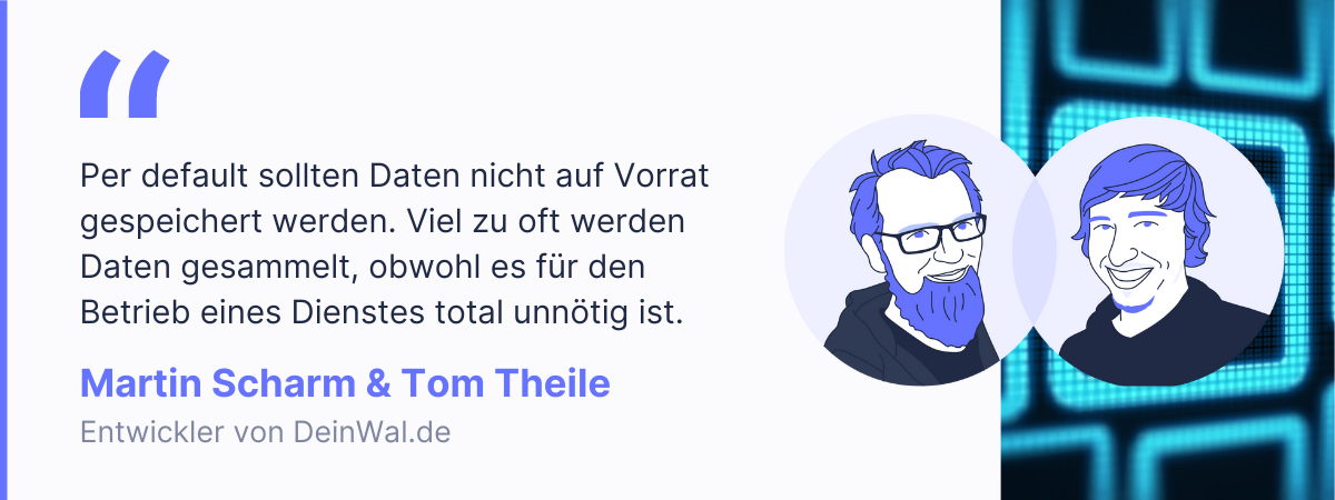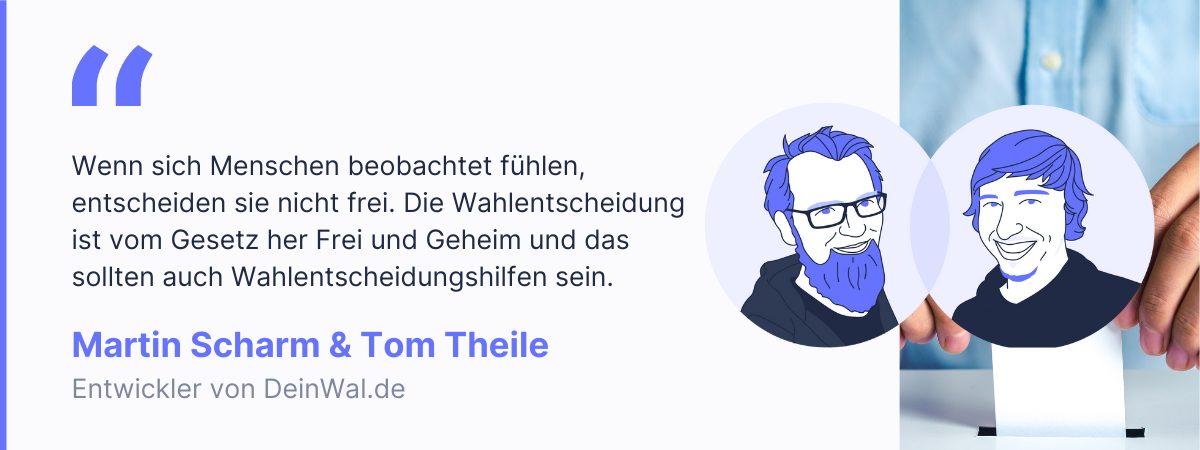 Tom und Martin sind die Entwickler von DeinWal.de – einer etwas anderen Wahlentscheidungshilfe, die sie zur Bundestagswahl 2021 neu aufgelegt haben. Bei DeinWal haben die beiden von Anfang an darauf geachtet, dass die Entscheidungen der Nutzer*innen nicht durch das Netz und insbesondere nicht an die Website-Betreiber geschickt werden. Damit haben sie Datenschutzmaßstäbe für technische Wahlentscheidungshilfen gesetzt. Mittlerweile haben andere Entscheidungshilfen wie der Wahl-O-Mat in Sachen Datenschutz nachgezogen. Wir haben mit den beiden über das Thema Datenschutz gesprochen. Ihr könnt ihnen auf Mastodon und Twitter folgen: Tom und Martin.