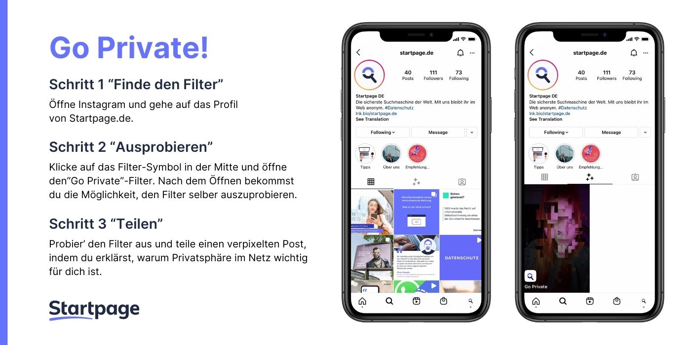 Mit dem neuen Instagram-Filter “Go Private” schlägt Startpage gleich zwei Fliegen mit einer Klappe: Es gibt nicht nur einen coolen neuen Filter, sondern auch einen Sinn dahinter. Denn mit der Nutzung dieses Filters könnt ihr Sichtbarkeit für das Thema Privatsphäre schaffen.