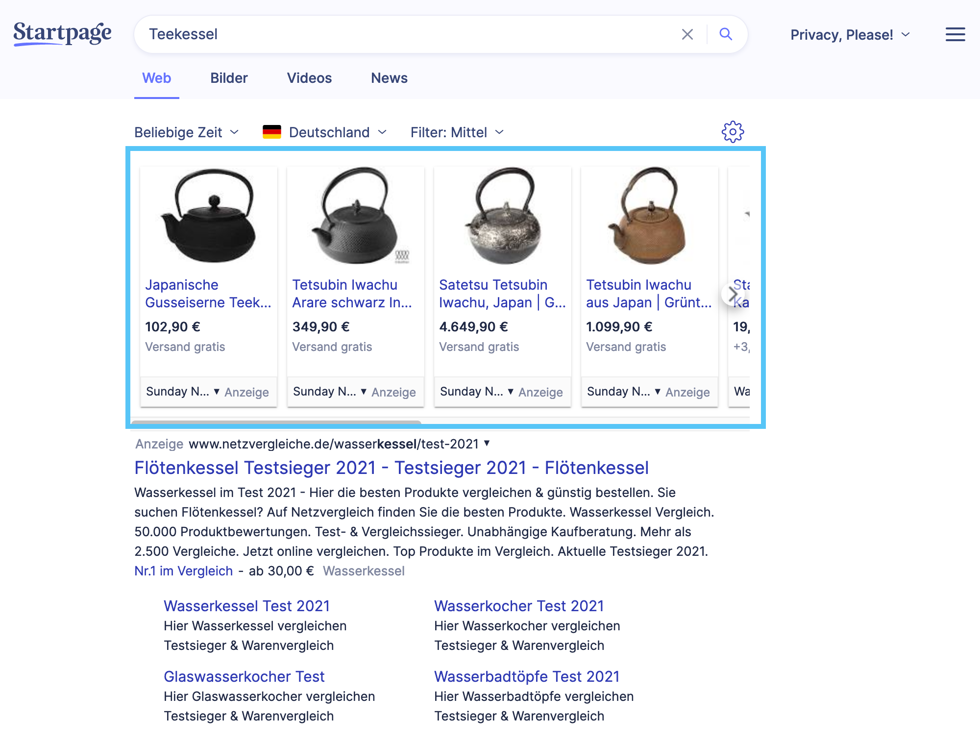 Deswegen freuen wir uns, euch unsere neue Shopping-Funktion zu präsentieren. Mit diesem neuen Feature könnt ihr ohne jegliches Profiling, Targeting oder Tracking Produkte online suchen und kaufen. Das bedeutet, dass wenn du über Startpage nach einem bestimmten Produkt suchst, dir anstelle von Anzeigen Kaufangebote angezeigt werden. Und da wir bei Startpage kein Profil von unseren Nutzern erstellen, könnt ihr sicher sein, dass die angezeigten Produkte für jeden Startpage-Nutzer den gleichen Preis haben. Nie wieder unfaires Preis-Tracking basierend auf eurem Standort, Gerät, Suchverlauf, oder Ähnlichem.