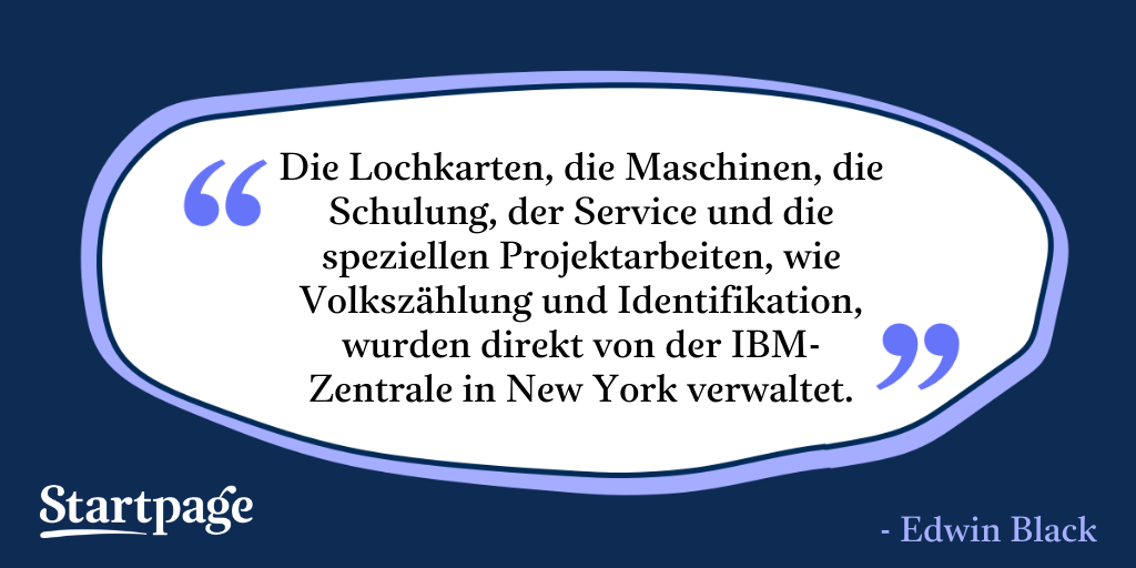 Ein Ergebnis dieser Partnerschaft war die Verwendung von so genannten Hollerith-Lochkarten in der Personenverwaltung des Deutschen Reichs. Diese Lochkarten wurden sowohl in den 1930er Jahren als auch zur Zeit des zweiten Weltkriegs von der nationalsozialistischen Verwaltung genutzt, um Personen zu kategorisieren. Aus deutschen Zensus-Daten wurden 1939 biometrische Angaben wie Geschlecht, Alter und Religionszugehörigkeiten auf Lochkarten übertragen, die dann mit Hilfe der DEHOMAG (Deutsche Hollerith-Maschinen Gesellschaft, einer 90%-igen Tochter von IBM) in relativ kurzer Zeit ausgelesen und sortiert werden konnten. Neben diesen Daten wurden auf einer so genannten “Ergänzungskarte” auch die “rassischen Merkmale” der jeweiligen Haushalte erfasst. Auf diese Weise konnten erstmalig auch jene deutschen Bürger*innen erfasst werden, die nur entfernte jüdische Verwandte hatten. Die Pläne zu einer solchen Nutzung des Hollerith-Systems wurden von IBM und dessen Chef Thomas Watson nicht nur gebilligt, sondern auch finanziell mit knapp einer Million Dollar (heute etwa 19 Mio Dollar) unterstützt.