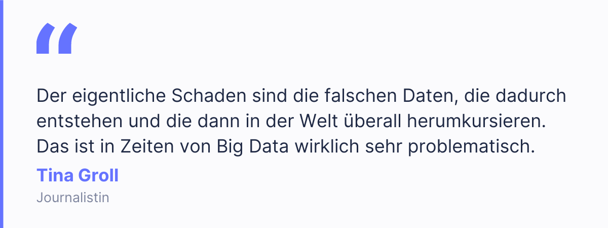 Woher die Täter ihre Daten haben, ist bis heute nicht geklärt. Für einen Identitätsdiebstahl reichen jedoch bereits Name und Geburtsdatum aus. “Der eigentliche Schaden sind die falschen Daten, die dadurch entstehen und die dann in der Welt überall herumkursieren. Das ist in Zeiten von Big Data wirklich sehr problematisch”, so die Journalistin.