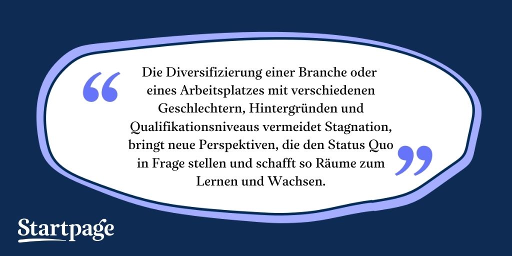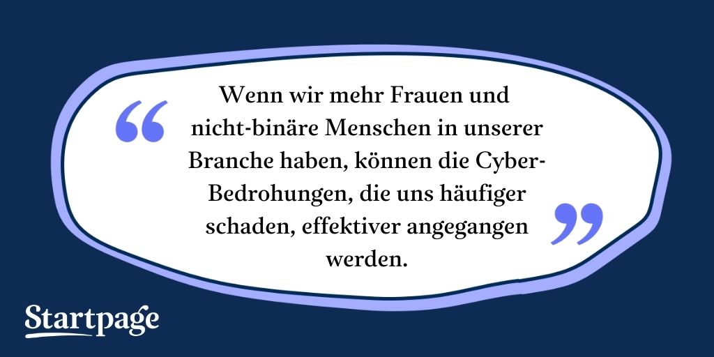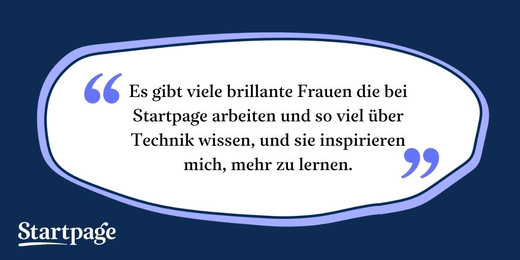 Kim: Als Frauen und nicht-binäre Menschen sollten wir besonders wachsam sein, was unsere Online-Privatsphäre angeht. Wir sind häufiger die Opfer von Cyber-Stalkern! So sehr wir uns über Stalkerware und andere Formen von Spyware Sorgen machen sollten, sollten wir auch vermeiden, dass Big Tech uns online verfolgt. Startpage zu unserer Standard-Suchmaschine in unseren Webbrowsern zu machen, ist ein einfacher Weg für uns, ein wenig Kontrolle zurückzuerlangen. Viele Frauen arbeiten bei Startpage! Ich denke, die meisten wären davon angenehm überrascht.