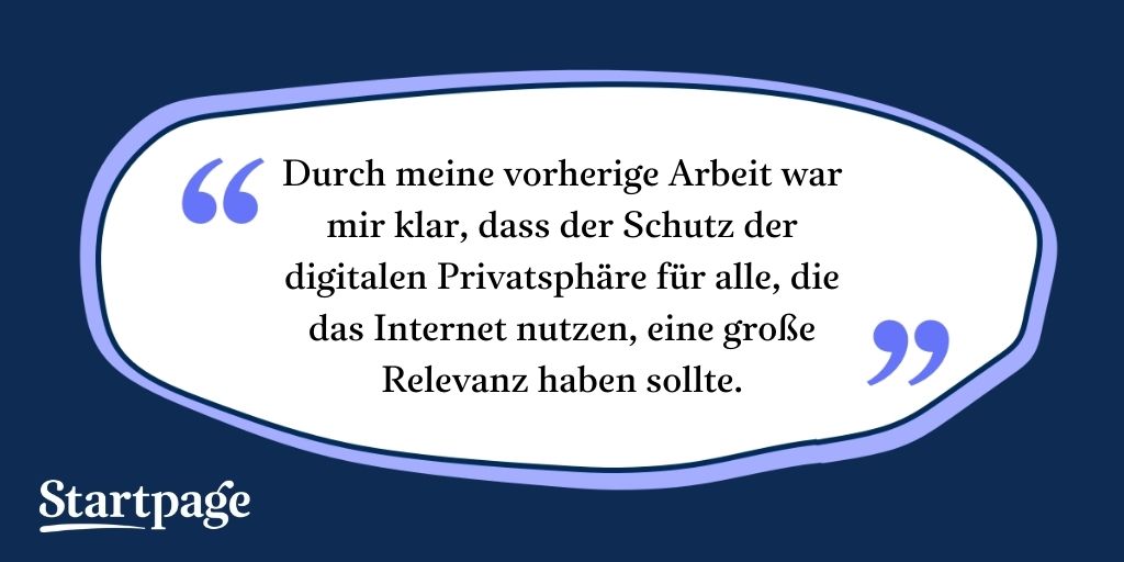 Alexandra: Vor Startpage habe ich im Non-Profit-Sektor für Organisationen gearbeitet, die positive Veränderungen in der Welt vorantreiben und Menschenrechte schützen. Dann wurde ich gehackt und erfuhr quasi am eigenen Leib, was für enorme Risiken für unsere Privatsphäre mit unserem digitalen Leben einhergehen – und wie machtlos man als Einzelperson ist, wenn man seine Daten an einen riesigen Tech-Konzern übergeben hat. Diese Erfahrung hat mir gezeigt, wie wichtig es für uns alle ist, die Kontrolle über unsere persönlichen Daten zurückzuerlangen. Ich hab mich dann mehr mit dem Konzept der Privatsphäre als Grundrecht auseinandergesetzt. Als sich die Möglichkeit bei Startpage ergab, war ich begeistert von der Idee, mehr Bewusstsein für das Thema Datenschutz und Privatsphäre als Grundrecht zu schaffen und anderen zu helfen, ihre Daten online zu schützen.