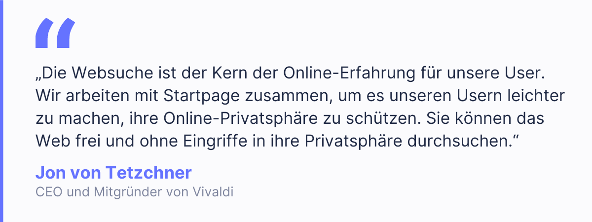 Wir haben Startpage mit dem Anspruch ins Leben gerufen, den Menschen die Kontrolle über ihre Daten zurückzugeben, dabei aber keine Kompromisse in der Qualität der Suchergebnisse zu machen. Darum bieten wir als einzige datenschutzfreundliche Suchmaschine Google-Ergebnisse, deren Index zu den besten weltweit gehört. Mit Startpage gibt es also hochwertige Suchergebnisse – bei vollem Datenschutz.