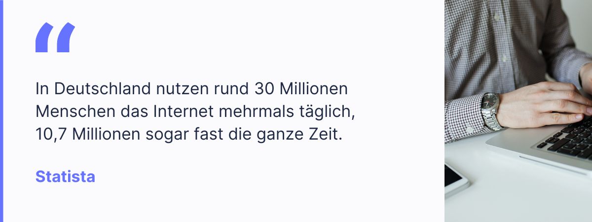In Deutschland nutzen rund 30 Millionen Menschen das Internet mehrmals täglich, 10,7 Millionen sogar fast die ganze Zeit. Während der Corona-Pandemie hat sich dieser Trend noch verstärkt. Denn unsere Aktivitäten verlagern sich immer weiter in den digitalen Raum: Wir verschicken private Nachrichten, kaufen online ein oder greifen auf Unterhaltungsangebote wie Filme oder Musik zurück.