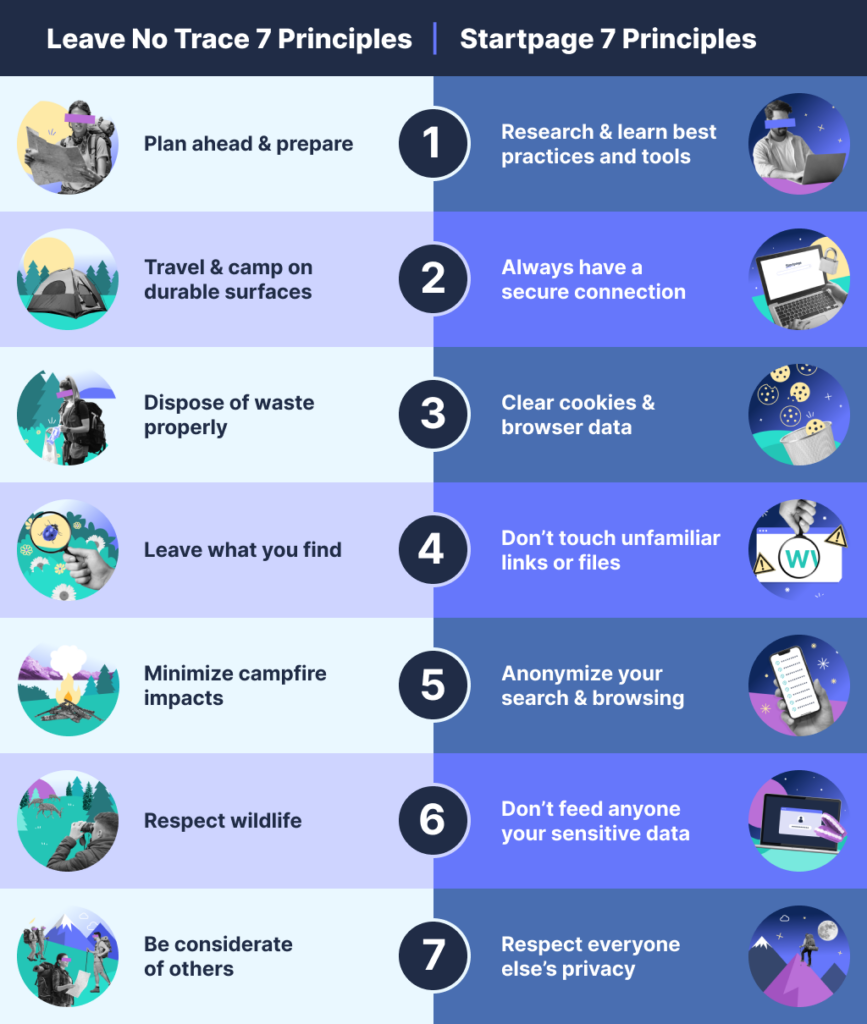 For years, Leave No Trace has been pioneering research, conservation, and education efforts to ensure that our parks, preserves, and other natural wonders are preserved for generations to come. Central to Leave No Trace’s advocacy and education are their 7 Principles, which empower would-be explorers with accessible and actionable best practices to ensure that their outdoor adventures don’t create negative impacts on the environment. And after learning about these 7 Principles ourselves, we here at Startpage felt inspired to do something similar and create our own 7 Principles that help online explorers ensure that their adventures leave no digital trace: