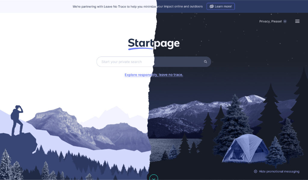 You may have noticed that our default homepage looks a little…different right now. We’ve introduced TWO new themes along with an exciting announcement! Startpage already helps millions of people leave no digital trace as they safely search and explore the internet. Now, as the weather warms up and people take to the outdoors, we are excited to partner with The Leave No Trace Organization to bring this same philosophy to users worldwide as they take time away from their screens and do some more exploring in nature.