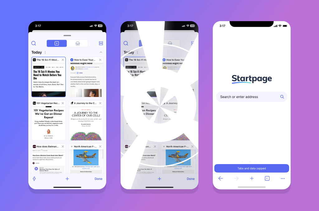 We’re thrilled to announce the launch of Zap, an electrifying feature now available on Startpage’s private search and browsing app for iOS and Android! With just one tap, Zap helps you protect your privacy by instantly closing all open tabs and clearing your browsing data—your personal data, wiped clean immediately.