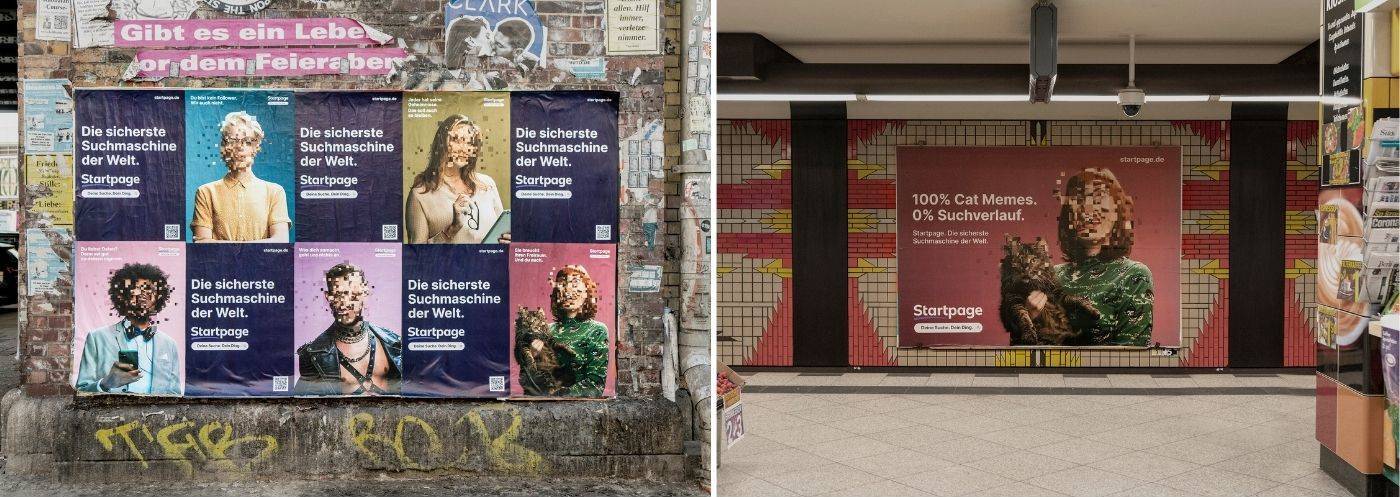 Startpage worked with Foundry, a creative agency based in Berlin, for the creation and production of the campaign. “When I search the internet for special dog food for our aging agency dog I get ads for dog coffins the next day. Startpage offers users the promise of surfing without worrying about trackers, data collection, and privacy breaches. It’s a promise we’ve translated into a campaign slogan in short, clear words: “Your search. Your thing.” Concise imagery with pixelated faces and provocative headlines highlight the benefits of private search without many words. Unusual locations that other brands would rather not venture into attract additional attention. We are sure that with the combination of suitable content and measures, we can sustainably support Startpage in its mission for more privacy on the Internet.” says Sacha Moser, CEO of Foundry.