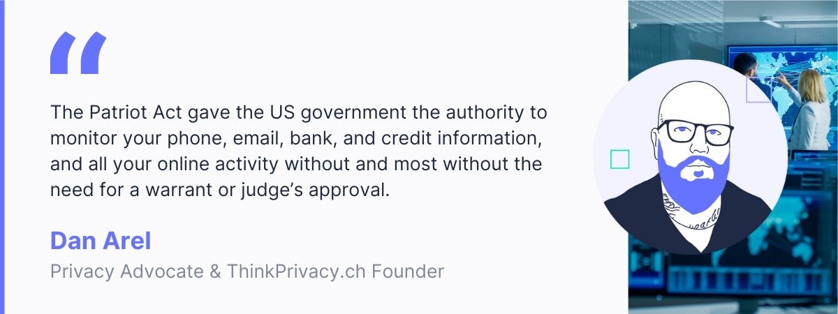 The Patriot Act gave the US government the authority to monitor your phone, email, bank, and credit information, and all your online activity without and most without the need for a warrant or judge’s approval. These are generally issued through National Security Letters (NSLs) which are issued by the FBI without a judge’s approval.