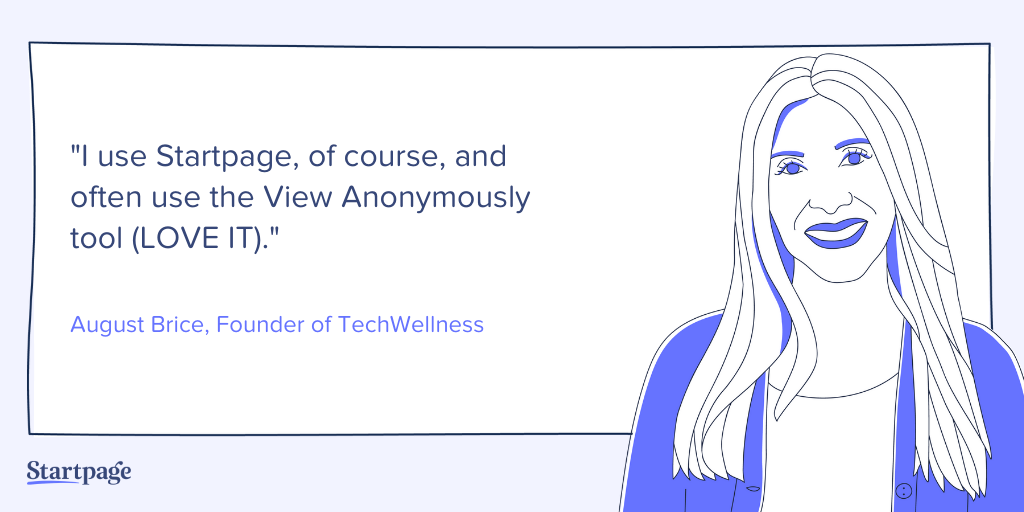 August: Many things! But here are a few that are important to me: I use a VPN. I’ve researched the various VPN providers and find Proton VPN to be the most trustworthy thus far. I use Firefox custom settings to block trackers, fingerprints, and cookies and I’m also very supportive of the progress being made by Safari’s new privacy commitment. I use Startpage, of course, and often use the View Anonymously tool (LOVE IT).