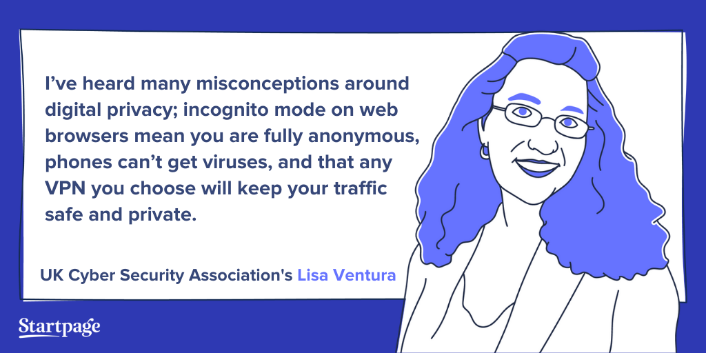 Lisa Ventura: I’ve heard many misconceptions around digital privacy, but some of the best ones include the fact that incognito mode on web browsers mean you are fully anonymous, that phones or Apple Macs can’t get viruses and that any VPN you choose will keep your traffic safe and private. These are all simply not true. People also expect that they will have anonymity on website until they provide some authentication, such as logging in with a username and password, but many sites often collect data well before this point. Education is key to debunking many of these misconceptions.
