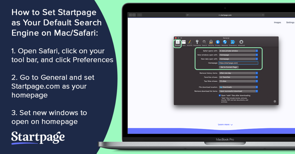 How to Make Startpage Your Default Search Engine: Safari > Preferences > General Tab > Enter startpage.com in the Homepage Field > Update new window and new tabs to open with Homepage