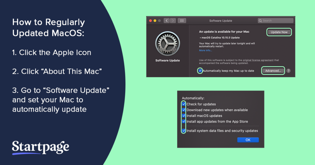 As a rule, you should keep all software up to date. If you receive an update notification, update as soon as possible. Often, macOS updates include security updates to protect your device. Consequently, if you put it off you’re leaving your Mac vulnerable to zero-day attacks. To make it easy, you can set your Mac to “Check for updates” or “Automatically keep my Mac up to date.”