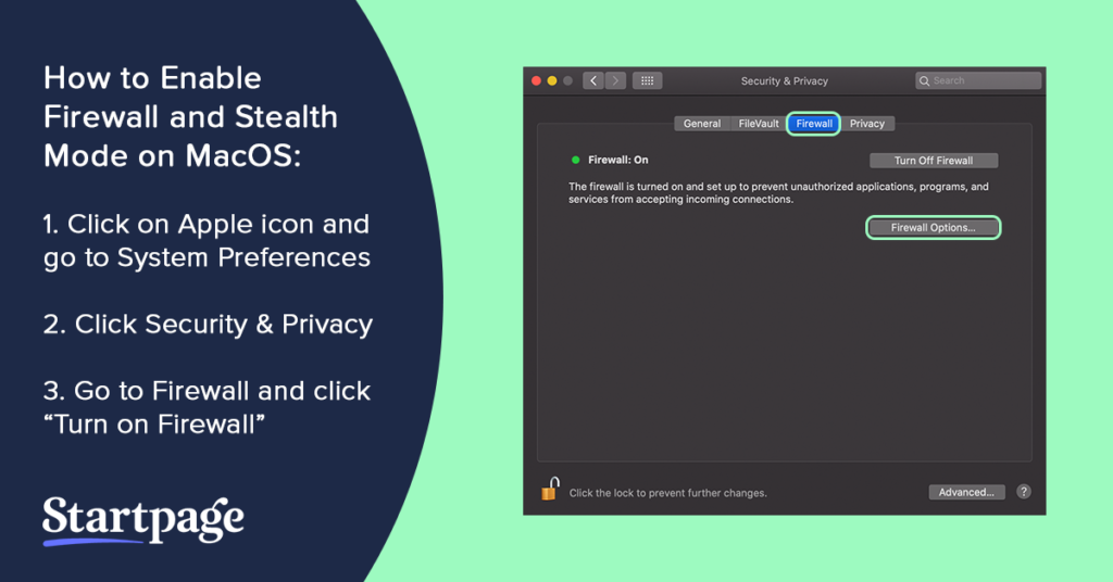 How to turn on Firewall and Enable Stealth Mode: Apple icon > System Preferences > Security & Privacy > Firewall