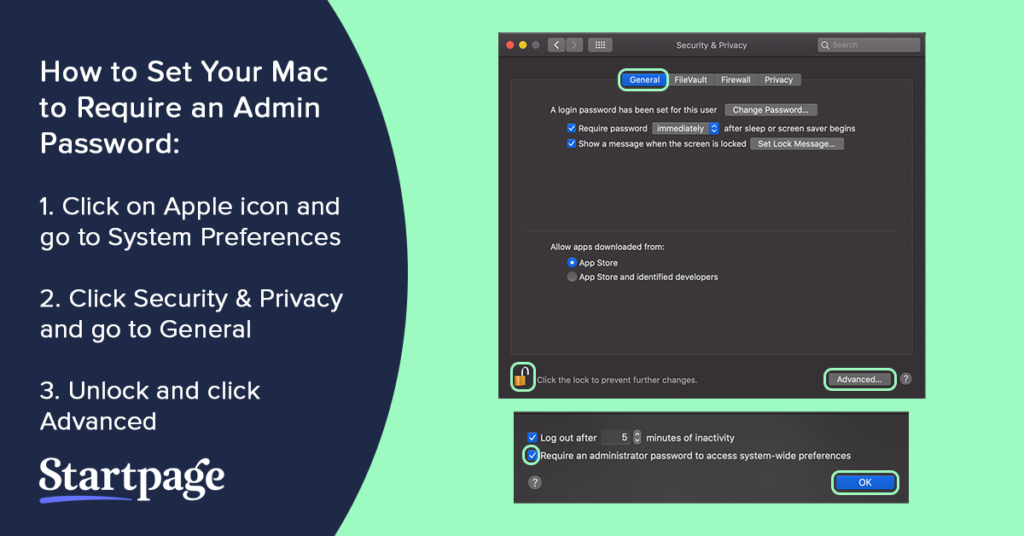 How to Require an Admin Password: Apple icon >System Preferences > Security & Privacy > General > Advanced