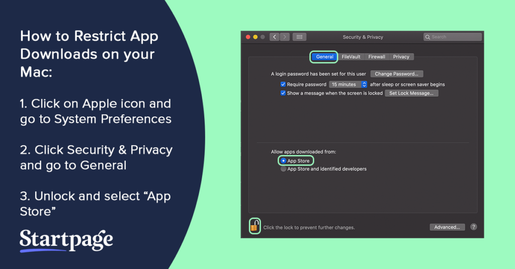 How to Restrict Which Type of Apps are Downloaded on your Mac: Apple icon > System Preferences > Security & Privacy > General