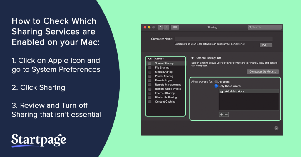 Sharing services like screen sharing, file sharing, and remote login come with security and privacy risks. Review your sharing preferences and turn off any that are not essential to your work.