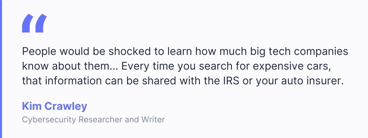 “People would be shocked to learn how much big tech companies know about them. Every time you use a non-private search engine to find fast food restaurants, that information can be shared with your health insurance company to increase your premiums and reduce your coverage. Every time you search for expensive cars, that information can be shared with the IRS or your auto insurer. And every time you search for bridesmaid dresses, that information can be shared with the wedding-industrial complex and all of a sudden your hotel bookings can skyrocket in price.