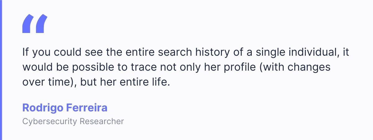 Now, is that even possible? As I said, I started my studies a short time ago. I invested some time in OSINT (opensource intelligence) while I have a lot of contact with people not at all concerned with privacy. This type of person has his whole life exposed. You know how much information you can get from just an email address, for example. And I consider email to be indirect information.’ A search engine is directly dealing with the interests of users. If you could see the entire search history of a single individual, it would be possible to trace not only her profile (with changes over time), but her entire life.