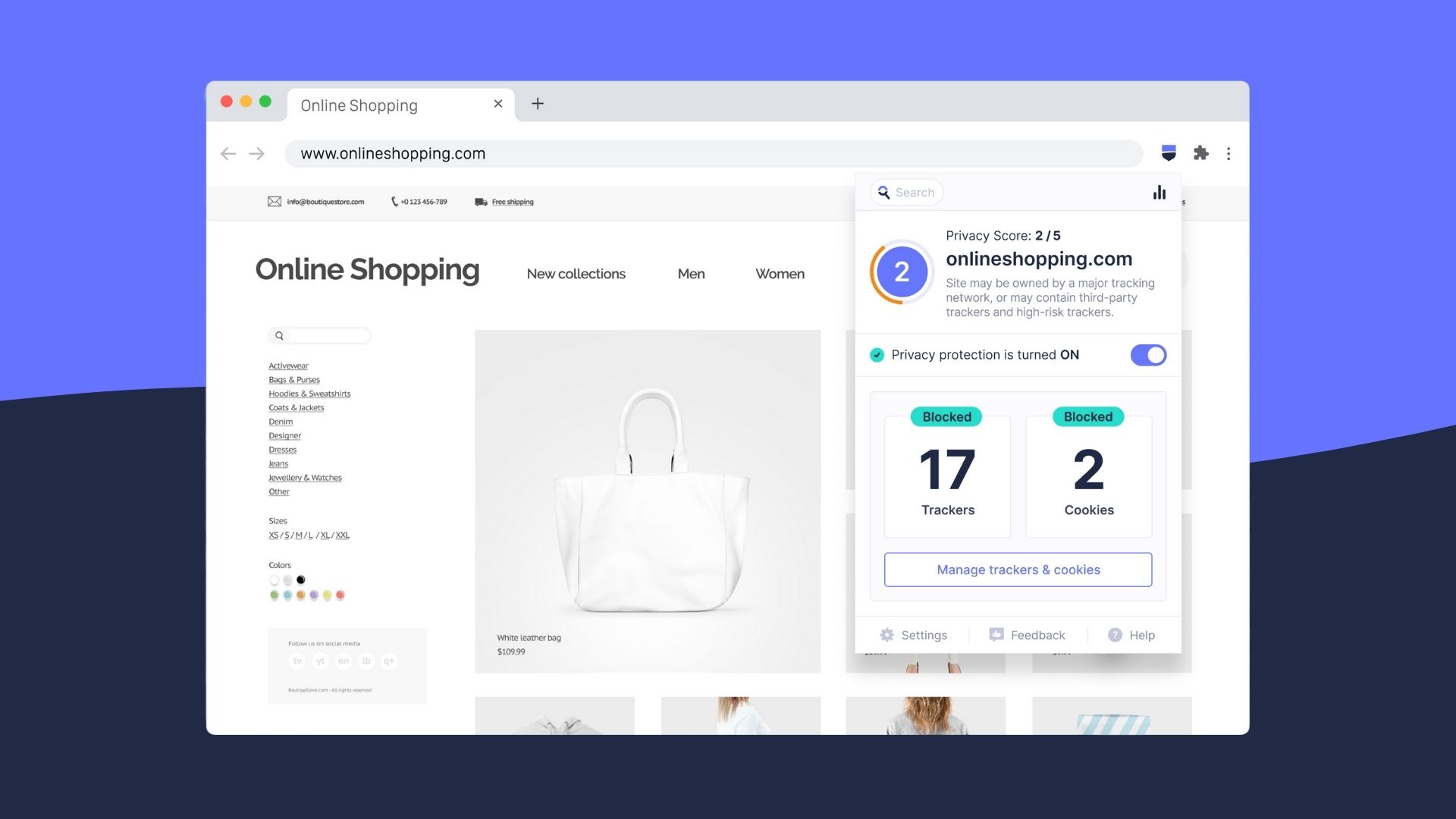 - Displays your privacy report, a breakdown of privacy scores by percentage of total sites visited and your total number of trackers and cookies blocked.