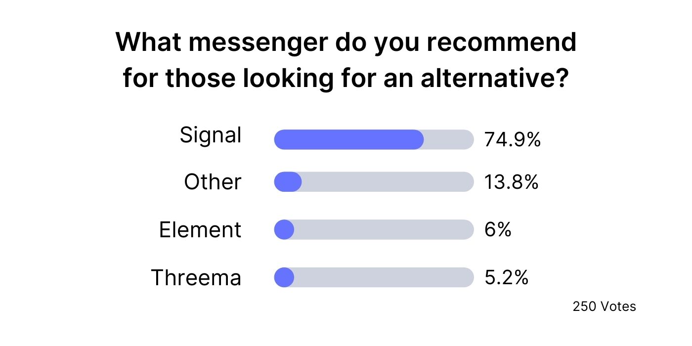 Signal was the most recommended messenger with 74.9% of the vote. Within the privacy community, it is a popular and frequently recommended messenger.