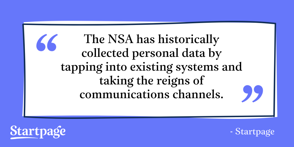 Although it sounds like a line out of a dystopian novel, it serves as an accurate description of NSA tactics. After all, the NSA has historically collected personal data by tapping into existing systems and taking the reigns of communications channels.