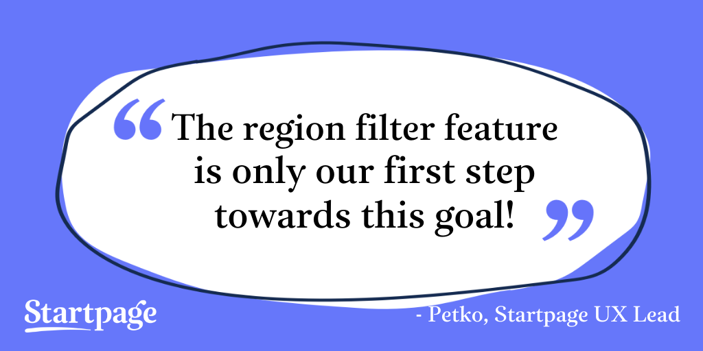 “Each search query is a question needing a specific answer, usually on a moment’s click. To achieve the best user experience we worked closely with our amazing Support team to understand how we could give our users the possibility to make Startpage their own personal “answer engine,” without trading their privacy for it. The region filter feature is only our first step towards this goal!”