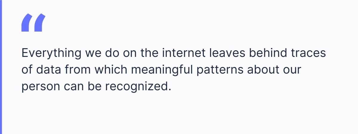 What makes our searches so intimate? How is it possible to create such precise reconstructions from traces of data? The answer is very simple: We often search impulsively and without the intention of presenting ourselves from a particular side. Our search queries are not statements with which we would position ourselves publicly, but an expression of the things that concern us acutely in the most varied of life situations. This also becomes clear when an eating disorder can be deduced from the participant’s data that she has never explicitly looked for.