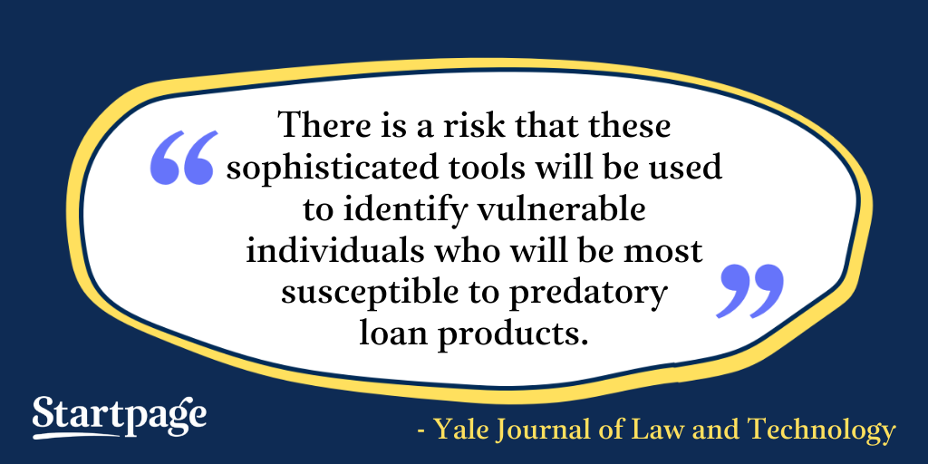 According to the Yale Journal of Law and Technology, “Given that big-data scoring tools are becomingly increasingly prevalent in the online payday-lending industry, there is a risk that these sophisticated tools will be used to identify vulnerable individuals who will be most susceptible to predatory loan products.” (https://digitalcommons.law.yale.edu/cgi/viewcontent.cgi?article=1122&context=yjolt)
